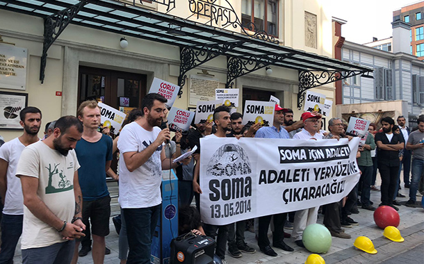 Süreyya Operası önündeki eylemde konuşma yapan Cihan Uyanık “13 Mayıs 2014’te, bu memleketin en büyük işçi katliamı Soma’da gerçekleşti. 301 maden işçisi hayatını kaybbeti, 168 kişi yaralandı. O günden bugüne dört senedir Soma için adalet talebimizi sürdürüyoruz” dedi.