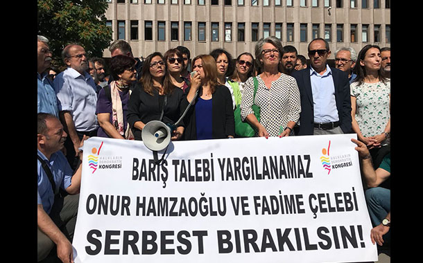 HDK Eş Sözcüsü ve Barış Akademisyeni Prof. Dr. Onur Hamzaoğlu ve ESP Genel Başkanvekili Fadime Çelebi’nin tutuklu yargılandığı davanın ilk duruşması devam ediyor. Duruşma öncesi, dayanışma için gelenler Ankara Adliyesi önünde “Barış talebi yargılanamaz” diyerek basın açıklaması yaptı.