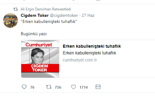 Soruşturma dosyasında Demirhan’ın Twitter hesabından 24 Haziran seçimleriyle ilgili yaptığı paylaşımlar “suç delili” olarak gösterildi. Bu delillerde ilk sıra Çiğdem Toker’in “Erken kabullenişteki tuhaflık” başlıklı yazısının RT’lenmiş olmasına verilmiş.