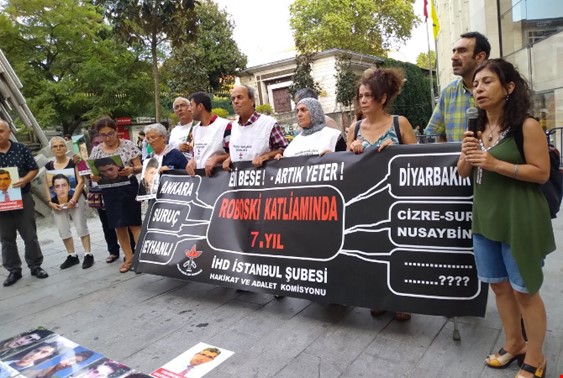 İHD İstanbul Şubesi üyesi Mukaddes Şamiloğlu, Roboski Katliamı’nın üzerinden 80 ay geçtiğini hatırlatarak, “‘Emri ben verdim’ diyen dönemin Başbakanı’nın olaydan sonra Genelkurmay Başkanı’nı arayarak tebrik etti ve katliamın sorumluları hakkında dava açılmasına izin vermedi. Bu süreçte, ailelere önce ‘kan parası’ verilerek susturulmak istendi. Ardından Genelkurmay Başkanlığı Askeri Savcılığı 2013 yılında verdiği takipsizlik kararı ile suçun faillerini ve sorumlularını cezasızlık zırhı ile korumaya aldı” dedi.