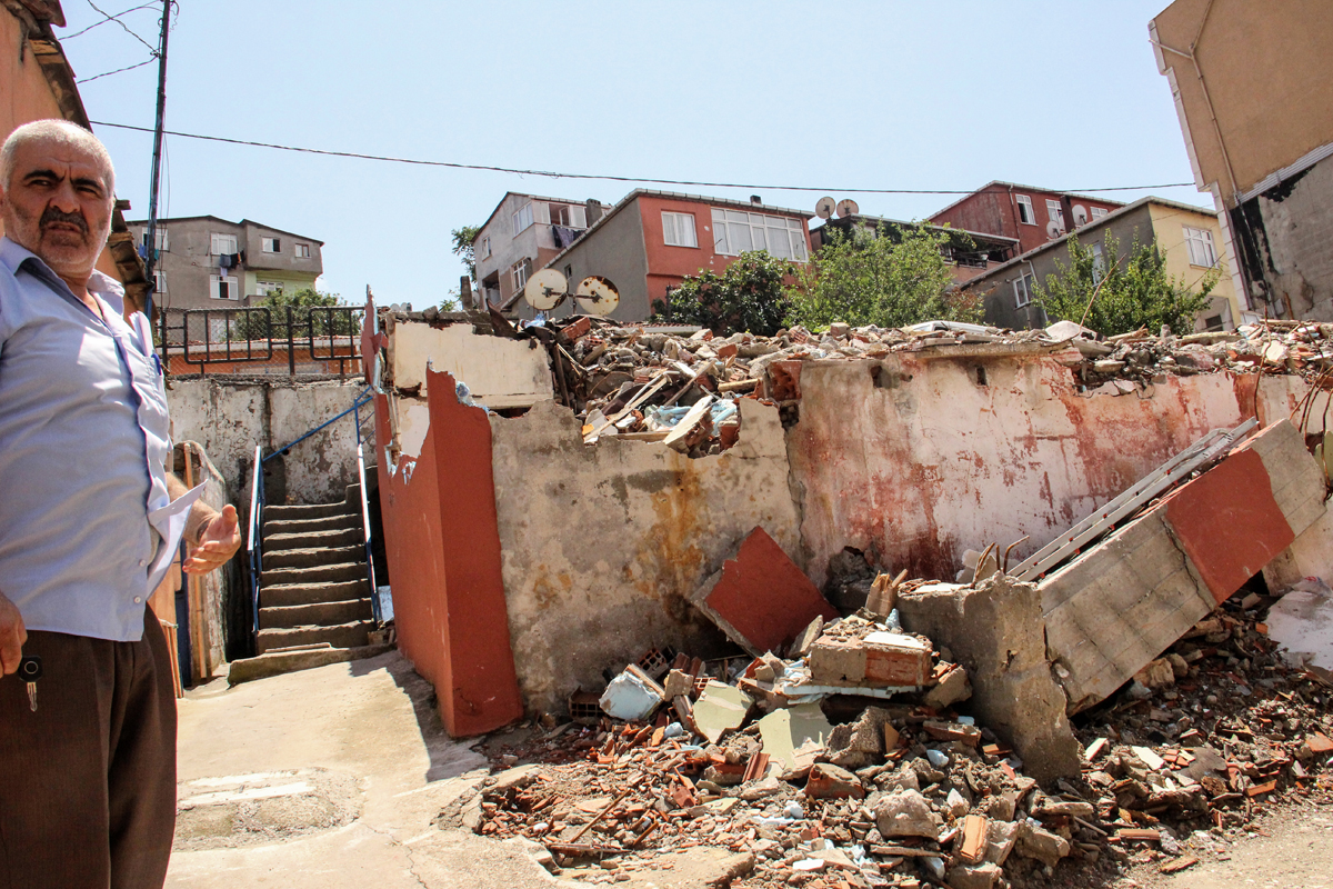 Biraz daha ilerledikçe muhteşem bir İstanbul manzarası da ayaklarımızın altına seriliyor. Bir abla sesleniyor bu sırada:“Şehrin en güzel yerinde bizleri yaşatırlar mı? Buraları zenginlere peşkeş çekecekler. Bizleri de en ücra köşelere atacaklar.”Bir esnafın dükkanına giriyoruz. İçerisi rutubet kokuyor. Hemen arkasındaki evin yıkımının ardından molozların kaldırılmamasını ve son günlerdeki yoğun yağışların da etkisiyle duvarların şiştiğini, içerisinin su içinde kaldığını gösteriyor.Tepeye yaklaştıkça cami inşaatının yakınındaki lüks apartmanlar dikkatimizi çekiyor.