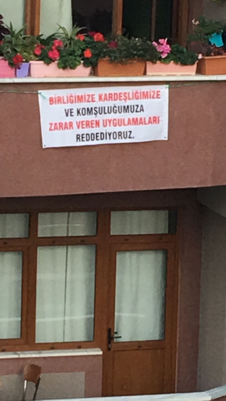 Mahalle halkının Erdoğan’ın yanına yaklaşmasına dahi izin verilmezken, evlerin pencerelerine asılan pankartlara polisler tarafından el konuldu.