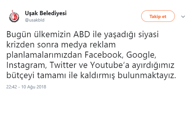 Türkiye ile ABD arasında yaşanan krize bir tepki de Uşak Belediyesi’nden geldi. Belediyenin resmi Twitter hesabından yapılan açıklamada “Bugün ülkemizin ABD ile yaşadığı siyasi krizden sonra medya reklam planlamalarımızdan Facebook, Google, Instagram, Twitter ve Youtube’a ayırdığımız bütçeyi tamamı ile kaldırmış bulunmaktayız” denildi.