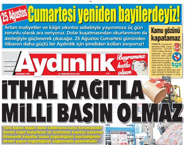 Artan doların kağıt fiyatlarını üç kat artırdığını ve kamu kurumlarının yazılı basının boğulmasını izlemekle yetindiğini söyleyen gazete, “Dolar kuşatmasından okurlarımızın da desteğiyle güçlenerek çıkacağız. 25 Ağustos Cumartesi gününden itibaren daha güçlü bir aydınlık için şimdiden kolları sıvıyoruz” dedi.