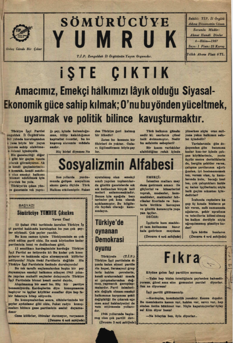 “Amacımız, emekçi halkımızı layık olduğu Siyasal-Ekonomik güce sahip kılmak; O’nu bu yönden yüceltmek, uyarmak ve politik bilince kavuşturmaktır.” Zonguldak’ta 4 Ekim 1967 tarihinde yayımlanan ilk sayısında Sömürücüye Yumruk, amacını bu satırlarla duyuruyordu. Sömürücüye Yumruk, Türkiye İşçi Partisi (TİP) Zonguldak il örgütü çevresinde ve Hüsamettin Güven ile Ahmet Hamdi Dinler’in öncülüğünde yayın hayatına başlamıştı.