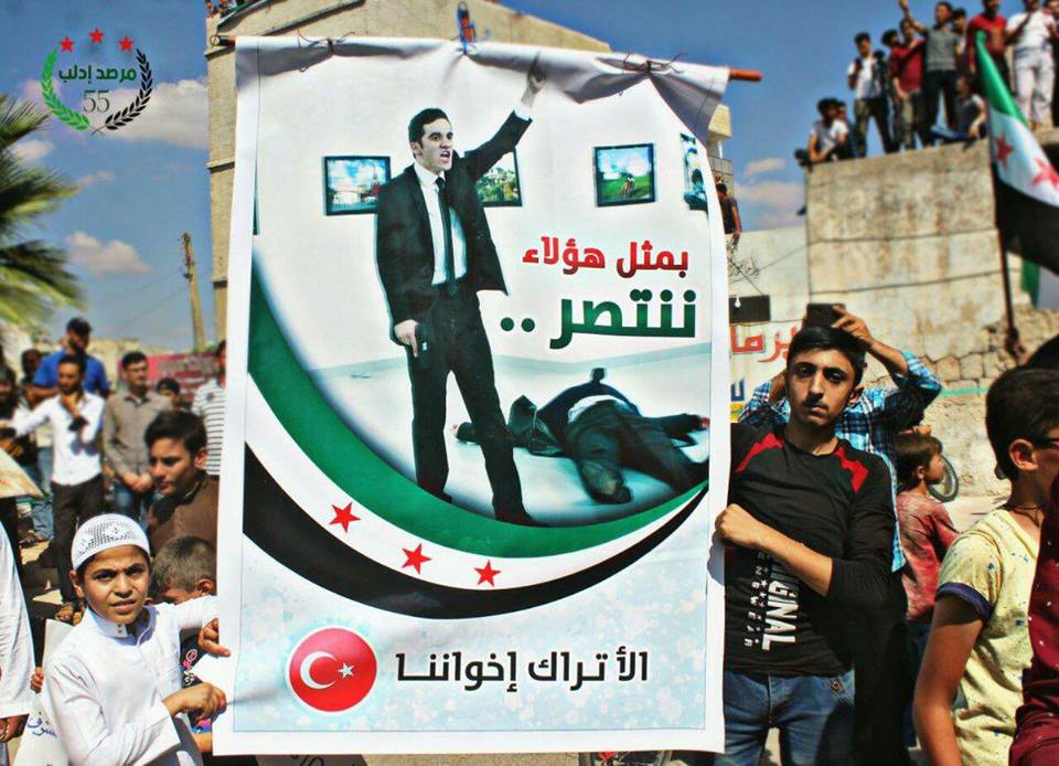 Suriye ordusu ve müttefiklerinin operasyonunu protesto eden İdlip’teki HTŞ yanlıları, Rus Büyükelçi Andrey Karlov’un katili polis Mevlüt Mert Altıntaş’ın posterini taşıdı