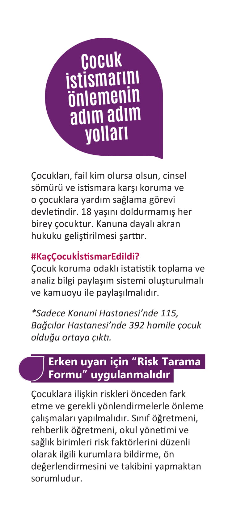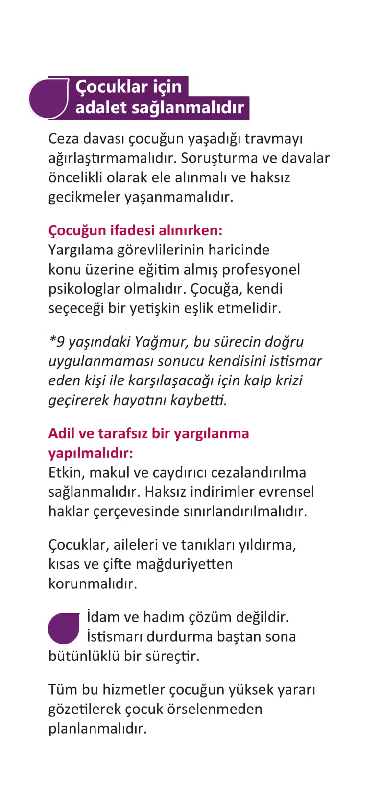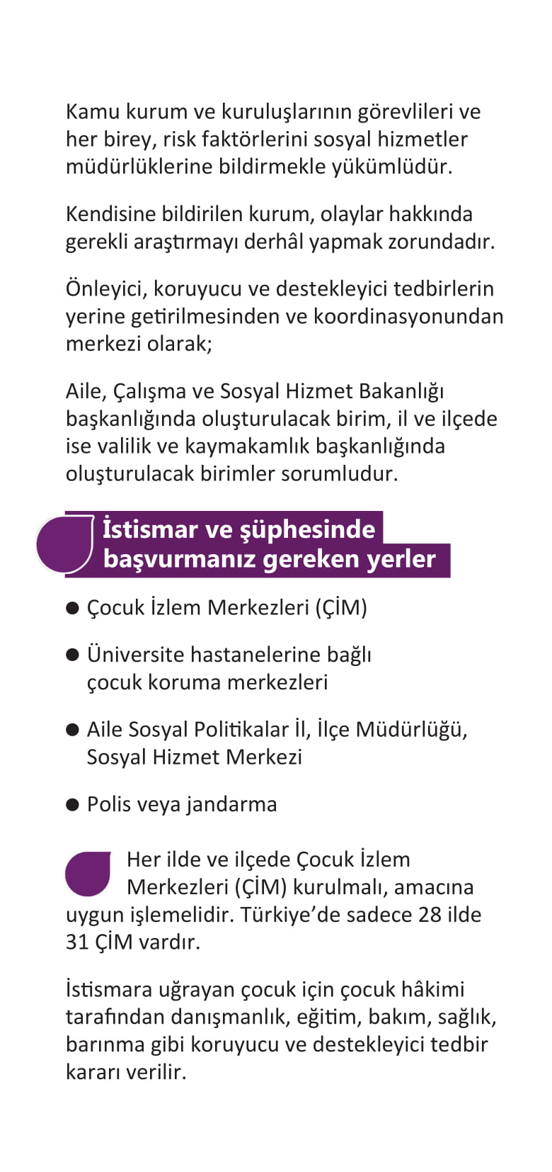 Çocuk istismarını durdurmak için öncelikle istismar suçu oluşmadan önüne geçmek önemlidir. Herkes bu broşürde adı geçen tüm kurumlara çocuklarının yüksek yararı için neler yaptığını sorabilir ve çocukların haklarının peşinde olabilir. Yasaların uygulanması ile ilgili bir ihlal, ihmal ya da zorluk yaşandığını düşünüyorsanız bize başvurun.
