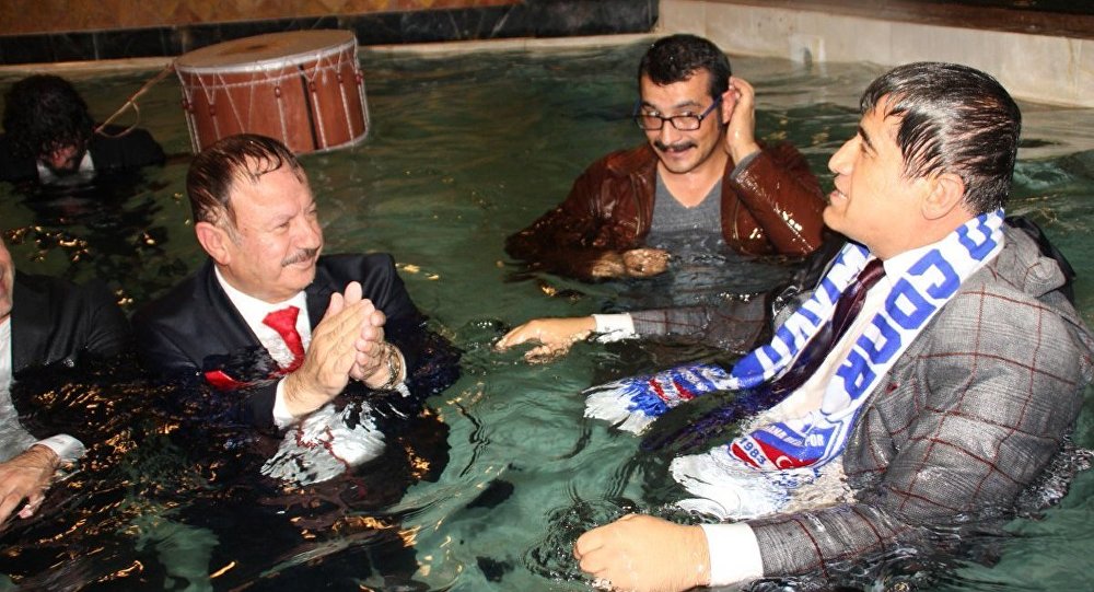 Gerçekten de böyle oluyor. Sunucu, belediye başkanı, ‘sanatçılar’ ve bir takım başka kravatlı zevat, kameralar eşliğinde kaplıca havuzuna giysileriyle dalıyor. Çocuksu görünmeye çalışırken budala görünen, sevimli olmaya çalışırken gülünç olan bir topluluk, suyun içine anlamsız şekilde dalıp çıkıyor; bir anlamı olmayan, herhangi bir duyguyu da işaret etmeyen çığlıklar atarak havuzda ‘eğleniyor’. Bu tür siyasi gösterilerde adet olduğu üzere boynuna yerel futbol takımının atkısını da asmış olan program yapımcısı “Başkanım hadi bi daha dalalım” falan diyerek performansı organize ediyor. Aralarında suya enstrümanıyla birlikte girmiş bir davulcu da var. Suyun içinde bile protokole uyarak bir iki adım geride duran (belediye bürokratı mı, ‘başkanın adamları’ mı, o kaplıca tesisinin ‘ihalesini kazanmış’ gözü açıklar mı bilinmez) birileri, ceplerinden çıkardıkları kağıt paraları serpiştiriyor, birer penguen gibi suya dalıp çıkan belediye başkanı ve sunucunun üzerine doğru. Milli hassasiyetin şeker olmadığını ve sudan etkilenmediğini de anlıyoruz: Serptikleri paranın “dolar değil TL” olduğunu birden fazla kez vurguluyor, hem parayı saçanlar, hem de kendisi için para saçılanlar… Sonra bir tepsi içinde çiğ köfte getiriliyor kaplıca havuzunun içine. Merhum Levent Kırca’nın absürt skeçlerini andıran bir ortamda, takım elbiseli adamlar suya batıp çıkmaya devam ediyor; Kürt sunucu, bir ya da iki kez, belli belirsiz ve bağlamsız “dilê min” diyor. Başkentin merkezine 75 kilometre mesafede, o başkente malik olanların arzu ettiği bir “Kürtlük” ile o maliklerce ihya edilmiş bir “kurnazlık” aynı suyun içinde çözülüyor, birleşiyor.