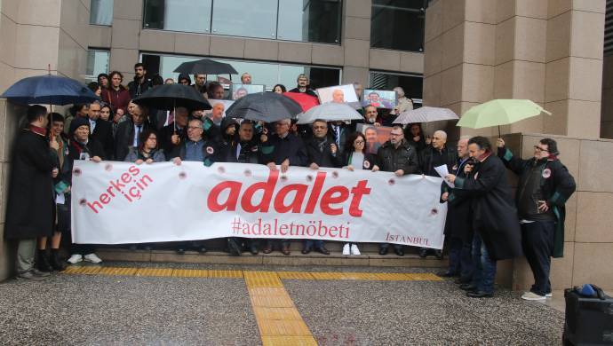 Avukatların, tutuklu meslektaşlarının serbest bırakılması için İstanbul Çağlayan Adliyesi’nde tuttukları Adalet Nöbeti, 80. haftasında devam etti.