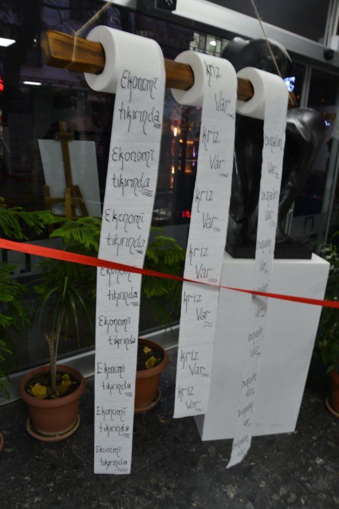 Sergide halkın ödemiş olduğu faturalara yer verilirken, son günlerde fiyatındaki artışlar ve üreticilerinin “stokçuluk”la suçlanarak depolarına baskın yapılmasıyla gündeme gelen soğan, su ve doğal gaz sayaçları, “kara delik” bölümünde ise Kaçak Saray’ın fotoğrafı yer aldı.