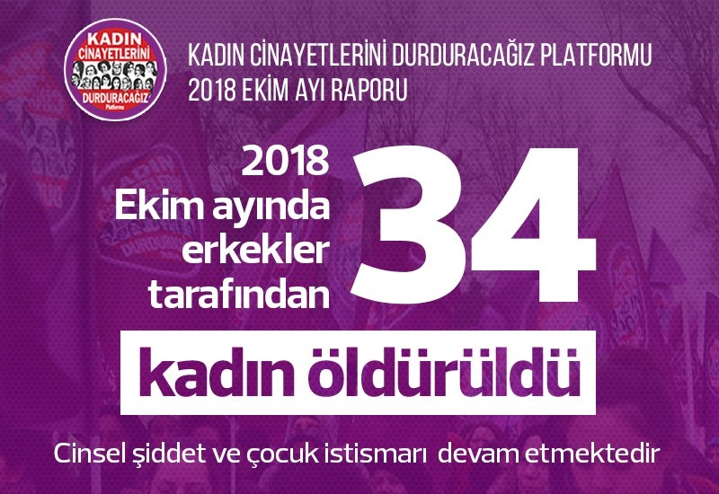 Kadın Cinayetlerini Durduracağız Platformu, 2018 ekim ayı veri raporunu yayımladı. Rapora göre ekim ayı içerisinde 34 kadın erkekler tarafından öldürüldü.