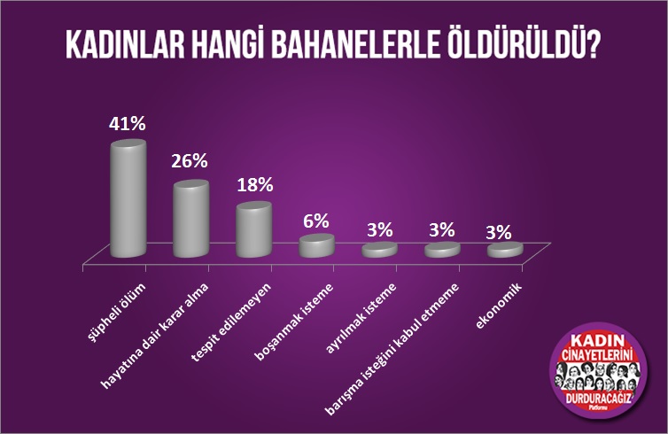 Bu ayki kadın cinayetlerinin 14’ü şüpheli ölüm, 6’sının nedeni tespit edilemedi; 9 kadın hayatına dair karar almak istediği için öldürüldü, 1’i ekonomik sebepler bahane edilerek, 1’i barışma isteğini kabul etmediği için, 1’i ayrılmak istediği, 2’si boşanmak istediği için öldürüldü.