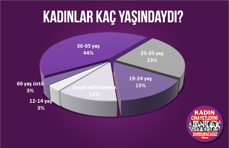 Kadınların 15’i 36-65 yaş, 8’i 26-35 yaş, 5’i 19-25 yaş, 1’i 12-14 yaş ve 31’i 66 yaş ve üzeri yaş aralığındaydı. 4’ünün yaşı tespit edilemedi. Antalya’da 36 yaşındaki Ziynet Terzi 8 yaşındaki oğlunun gözünün önünde, ayrılmak istediği için E.Ç. tarafından ateşli silahla sokak ortasında öldürüldü.