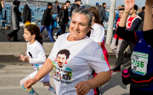 Emel Korkmaz, 2018 İstanbul Maratonu’nda, Gezi Direnişi’nde polis tarafından katledilen oğlu Ali İsmail Korkmaz’ın düşlerini gerçekleştirmek için koşuyor