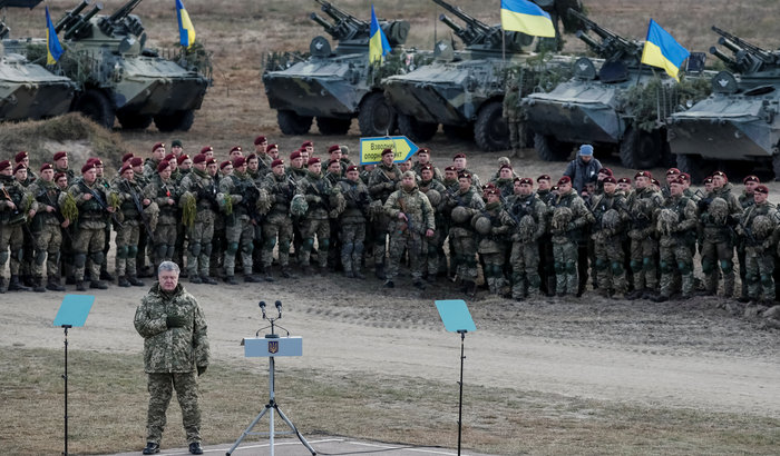 Ukrayna Cumhurbaşkanı Petro Poroshenko Zhitomir’e bir asker ziyareti sırasında milli marşı söylüyor (21.11.2018). Fotoğraf: Gleb Garanich / Reuters.