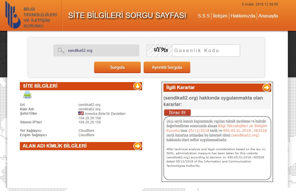 BTK’nin resmi sitesinde “site bilgileri sorgu sayfası”nda 6 Aralık 2018 perşembe günü saat 15.18’de alınan ekran görüntüsü: