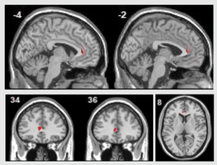Majör depresyon hastaları psikolojik terapinin ardından sol rostral ön singulat kortekslerinde aktivite artışı göstermişlerdir. Görsel: Sankar et al, 2018