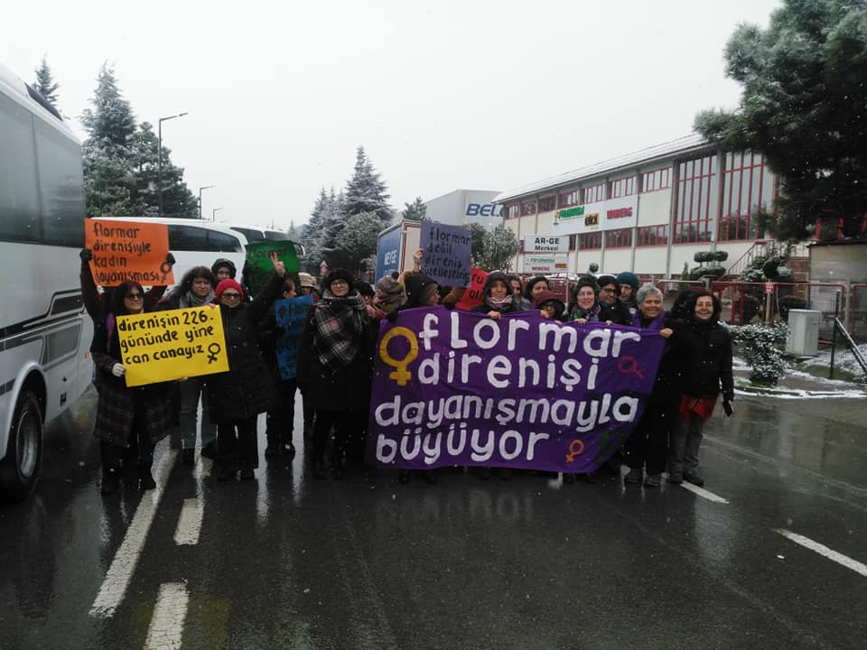 Yoğun kar yağışına rağmen “Flormar direnişi dayanışmayla büyüyor” pankartıyla direniş alanına gelen kadınlar, sık sık “Flormar değil, direniş güzelleştirir”, “Flormar ürünlerine boykot” sloganları attı.