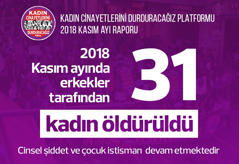 Kadın Cinayetlerini Durduracağız Platformu, 2018 kasım ayı veri raporunu yayımladı. Rapora göre kasım ayı içerisinde 31 kadın erkekler tarafından öldürüldü.