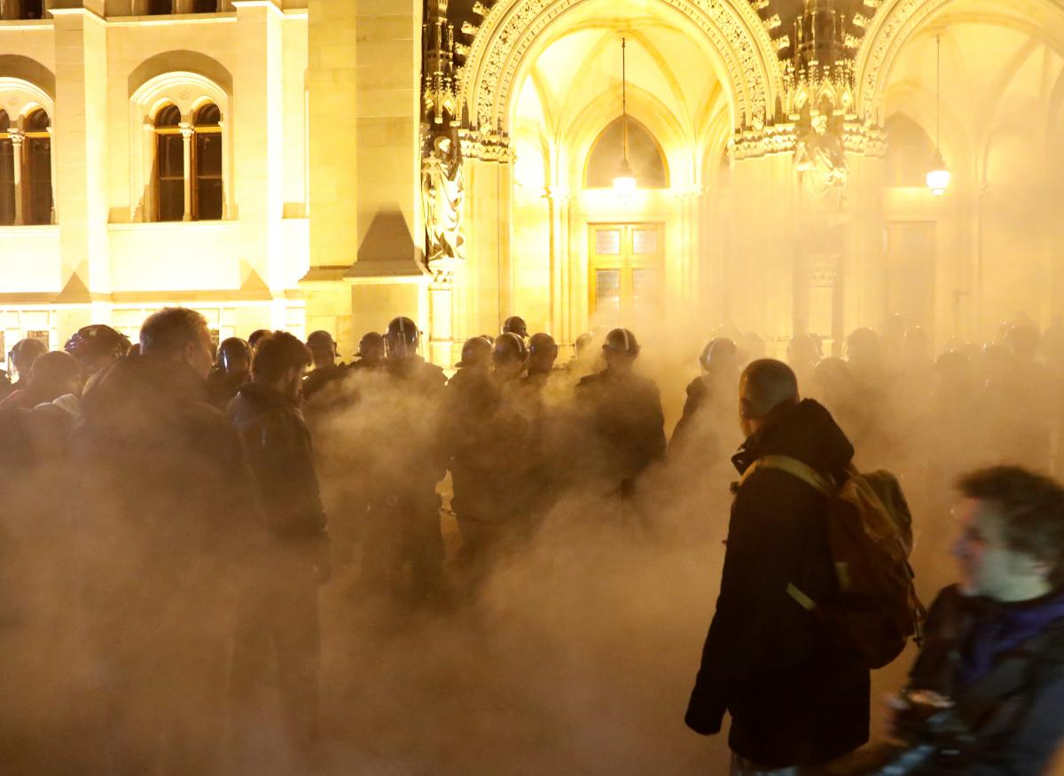 Parlamento binası önünde toplanan eylemciler binanın önüne barikat kuran polislerin yüzüne karşı “Hainler”, “Orban cehenneme” sloganları attı.