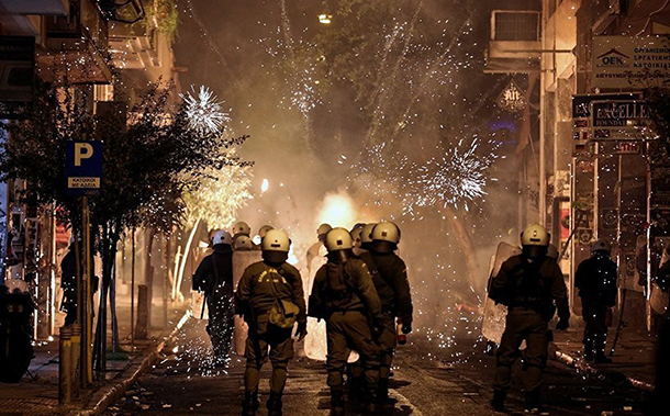 Atina’da öğrenci dernekleri ve sol grupların çağrısıyla yapılan gündüz yapılan yürüyüşün ardından polis ile eylemciler arasında çatışma çıktı. Polisin göz yaşartıcı gaz, ses bombaları ve tazyikli suyla saldırısına eylemciler taş, havai fişek ve molotofkokteyli ile karşılık verdi.