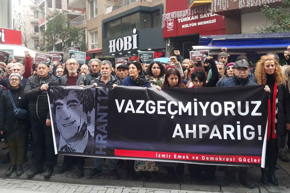 İzmir Alsancak Türkan Saylan Kültür Merkezi önünde bir araya gelen yurttaşlar,”Faşizme inat kardeşimsin Hrant” sloganları atarken “Vazgeçmiyoruz Ahparig!” pankartı taşıdı.