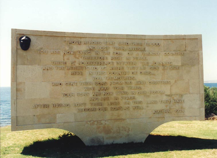 Burada, dost bir vatanın toprağındasınız. Huzur ve sükun içinde uyuyunuz. Sizler, Mehmetçiklerle yanyana koyun koyunasınız. Uzak diyarlardan evlatlarını harbe gönderen analar! Gözyaşlarınızı dindiriniz. Evlatlarınız bizim bağrımızdadır. Huzur içindedirler ve rahat uyuyacaklardır. Onlar bu topraklarda canlarını verdikten sonra, artık bizim evlatlarımız olmuşlardır.
