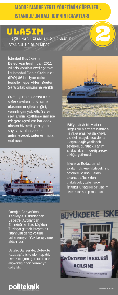 “Kentlerin ihtiyaçlarının değil, proje fetişizminin egemen olduğu, kentte insanca yaşam hakkının değil rantın nasıl paylaşılacağının konuşulduğu bir ortamda İstanbul’un durumunu, neye ihtiyacı olduğunu, yerel yönetimin görevlerini ve neler yapıldığını özetlemek istedik” diyen Politeknik İstanbul’un halini ulaşım, barınma, sağlık, çevre hakkı, altyapı hizmetleri, kent-tarım ilişkisi ve sosyal ve kültürel alanlar, hizmetler başlıkları altında raporlaştırdı.