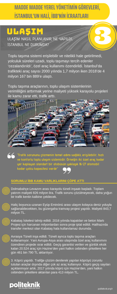 Toplu taşıma sistemi erişilebilir ve nitelikli hale getirilmedi, yolculuk süreleri uzadı, toplu taşımayı tercih edenler ‘cezalandırıldı’, özel araç kullanımı özendirildi. İstanbul’da trafikteki araç sayısı 2000 yılında 1,7 milyon iken 2018’de 4 milyon 167 bin 889’e ulaştı.