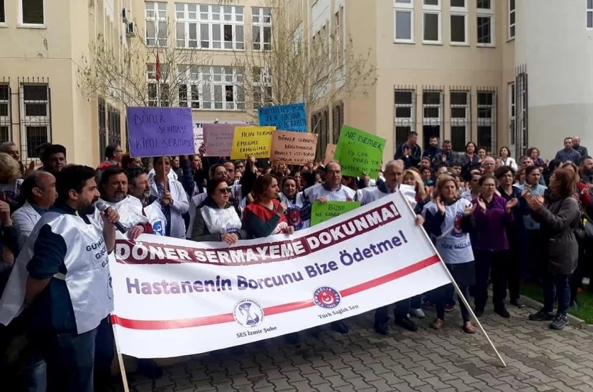 İzmir’de SES ve Türk Sağlık-Sen üyeleri, döner sermaye kesintilerini protesto etmek için Ege Üniversitesi Tıp Fakültesi Hastanesi’nde eylem yaptı