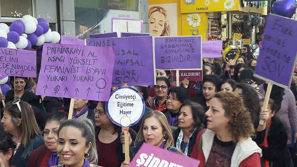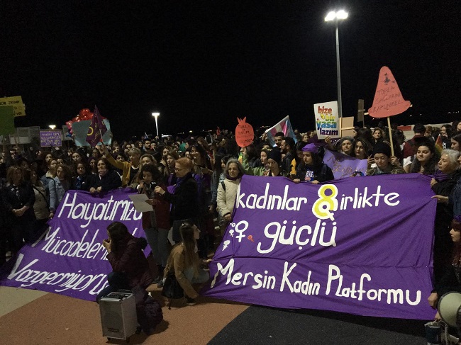 “Haklarımızın peşindeyiz. Bir daha eksilmeyeceğiz” diyen kadınlar ve LGBTİ+’lar Mersin Kadın Platformu ve Mersin Kadınlar Birlikte Güçlü çağrısıyla saat 18.30’da Pozcu Kushimato sokağında buluştu. Toplanmanın ardından yolu kapatarak Barış Meydanı’na yürüyüş gerçekleştirildi. Sloganlar ve şarkılar eşliğindeki yürüyüşe katılım ve ilgi yoğundu. Barış Meydanı’na varıldıktan sonra basın açıklaması okundu.