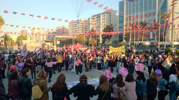 İzmir’de Kadınlar Birlikte Güçlü’nün çağrısı ile bir araya gelen kadınlar “Bu konuda ciddiyiz, Dünya’yı değiştireceğiz” pankartı ile yürüdü.