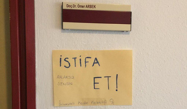 Bu konuşmanın üzerine harekete geçen Üniversiteli Kadın Kolektifi, Arbek’in odasının girişine “Ahlaksız sensin, istifa et!” ve “Cinsiyetçi biri bizim hocamız olamaz” yazılı dövizler astı.
