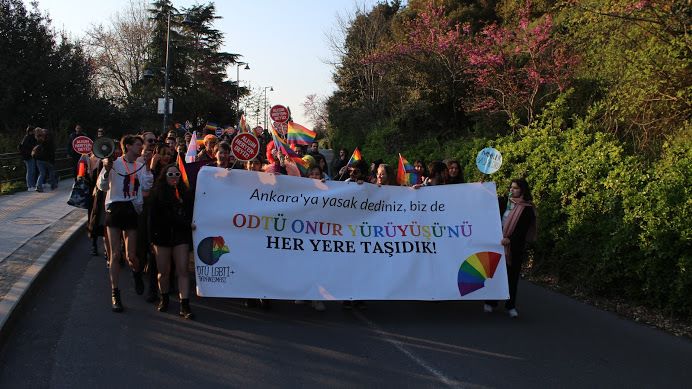 Güney Kampüs’te yapılan yürüyüşte üniversiteliler, Ankara Valiliği’nin Kasım 2017’den beri sürdürdüğü “sınırsız LGBTİ etkinlik yasağı”na tepki gösterdi, “Ankara’ya yasak dediniz, biz de ODTÜ Onur Yürüyüşü’nü her yere taşıdık” yazılı pankart açtı.