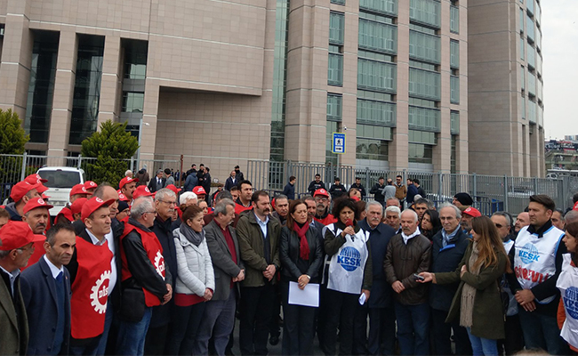 DİSK, KESK, TMMOB ve TTB’nin çağrısıyla biraraya gelen sendika, meslek örgütü ve demokratik kitle örgütleri Çağlayan Adliyesi’nde “Halkın iradesine, seçme ve seçilme hakkına, İstanbul’a saygı” talebiyle bir basın açıklaması gerçekleştirdi