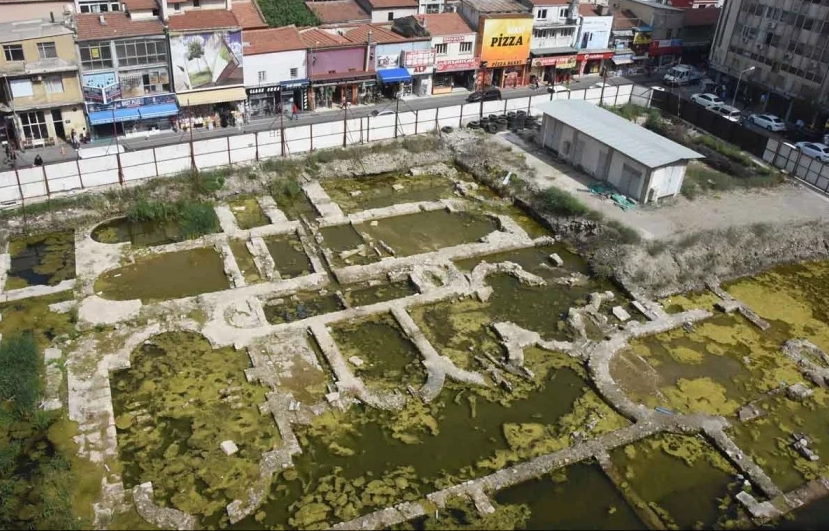İzmir Konak’ta üç yıl önce bir inşaatın zemininden çıkan yaklaşık 2 bin yıllık Roma kalıntıları, üç yıldır harekete geçilmediği için yosun bağladı. Kalıntıların korunması için Koruma Kurulu’nun sit kararı alması gerekiyor