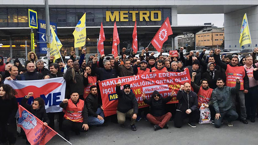 Yücedağ: Metro ödemeyi kabul etmiyor, çünkü binlerce işçisi var. Direnişle, eylemle kazanım elde edildiğinde toplu sözleşmede yaşanacaklardan korkuyor. Tabii sarı sendikaların da yönlendirmesi var. Onlarla uyumlu çalışıyorlar, sarı sendikaların yöneticileri de koltuklarını kaybetmek istemiyor. Basının etkisi de az değil, çünkü reklam olsun, bilet olsun, onlar da nemalanıyor. Sınıf sendikacılığının güçlü olduğu yerde nemalanmaları zor. Türk-İş zaten görmüyor; sosyal medyada Nakliyat-İş’in Tüvtürk direnişini paylaşan DİSK de Real, Makro direnişini görmüyor, paylaşmıyor. Bu direniş görmezden gelinmeye, yalnızlaştırılmaya çalışılıyor. Çünkü direniş kazanılırsa sarı sendikacılık ciddi anlamda yara alacak.