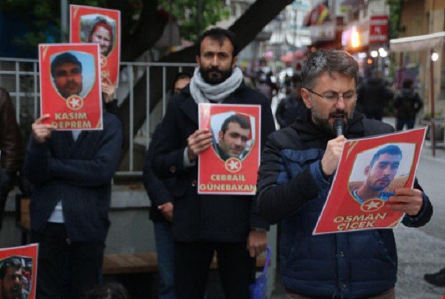 Suruç’ta katledilen 33 düş yolcusunun fotoğraflarının taşındığı eyleme, ESP Genel Başkanvekili Şahin Tümüklü, ESP İl Başkanı Pınar Türk, SGDF Eş Başkanı Okan Danacı, HDP MYK Üyesi Emine Kaya ve tecridin kaldırılması talebiyle direnişte olan olan mahpuslara destek için 2 gündür açlık grevinde olan ESP, SGDF ve SKM üyeleri de katıldı.