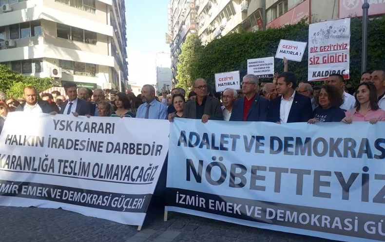 Evrensel’in haberine göre “Hırsız AKP işbirlikçi YSK”, “Faşizme karşı omuz omuza”, “Diren İstanbul İzmir seninle” sloganları atılan açıklamayı DİSK Ege Bölge Temsilcisi Memiş Sarı yaptı.