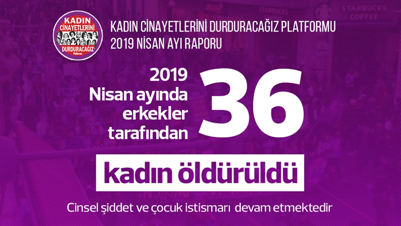 Kadın Cinayetlerini Durduracağız Platformu, 2019 nisan ayı veri raporunu yayımladı. Rapora göre nisan içerisinde 36 kadın erkekler tarafından öldürüldü