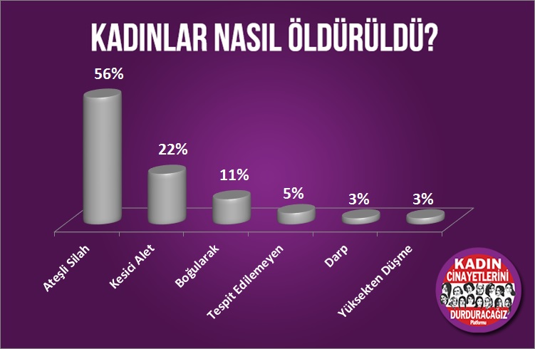 20’si ateşli silahlarla, 4’ü boğularak, 8’i kesici aletle, 1’i darp edilerek, 1’i yüksekten düşerek ve ne yazık ki 2’sinin nasıl öldürüldüğü tespit edilememiştir.