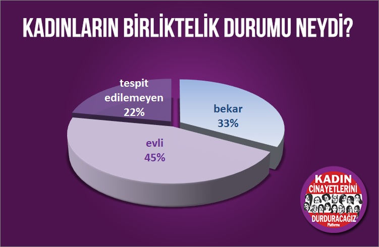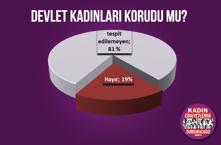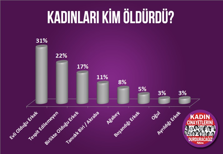 36 öldürülen kadının 8’inin kim tarafından öldürüldüğü tespit edilemedi, 11’i evli oldukları erkekler, 6’sı birlikte olduğu erkek,1’i oğlu, 4’ü tanıdık/akraba, 2’si boşandığı erkek, 1’i ayrıldığı erkek, 3’ü ağabeyi tarafından öldürüldü.