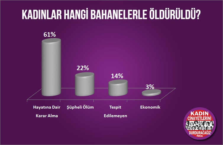 5 kadının hangi bahane ile öldürüldüğü tespit edilememişken, 22 kadının kendi hayatına dair karar almak isterken, 1’i de ekonomi bahane edilerek öldürülmüştür. 8 kadının şüpheli ölümü ise aydınlatılmayı bekliyor.