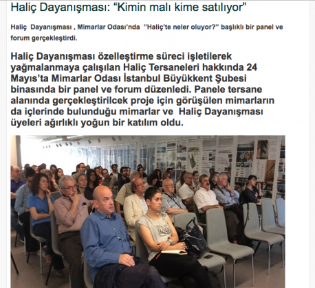 Haliç Dayanışması’nın sorun ettiği konular üzerine XXI’deki bu yazıdan önce ve sonra çok sayıda yazı yazıldı, basın açıklaması yapıldı.2 Bunların büyük kısmı süreci kamuoyu ile paylaşmak, bu süreçte rol alanlardan açık bilgi talep etmek, itiraz eden tersane işçileri, mahalleliler, meslek örgütleri, demokratik kitle örgütleri vd. ilgili kişi ve kurumların görüşlerini aktarmak üzere hazırlandı. Bu hareketin içinde yer alan bir mimar ve koruma uzmanı, aynı zamanda da yıllarca tersaneler alanını çalışmış biri olarak, başlıkta söz ettiğim gibi tasarım veya danışmanlık yapan bir konumda yer alabilirdim (birkaç ayrı yerden teklif gelmedi de değil). Ancak hiç de katılımcı olmayan, katılımcı ortam olsa bile bu ülke koşullarında -HD olarak katıldığımız Çevre Etki Değerlendirme toplantısında olduğu gibi- gayet eşitsiz bir koşulda, bitmiş projenin sunumunun halk katılımı olarak ifade edildiği bir ortamda konum almak anlamına gelecekti bu.4 Oysa ki “iyi mimarlığı” kamu yararı ve halk tarafında olmak olarak gören bir sınıf bilincine sahipseniz tarafınız da çok net oluyor.