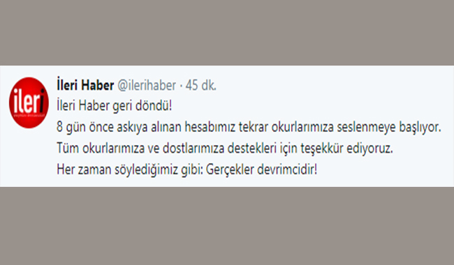 İleri Haber, yaptığı paylaşımla Twitter hesabının yeniden açıldığını duyurdu.