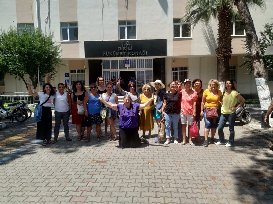 Kaymakamlık bahçesinde oturma eylemine geçen kadınlar, herkesi Dikili İlçe Jandarma Karakolu Komutanı Alaattin Duru’yu arayarak, “yasaklama” kararının gerekçesini sormaya çağırdı. Ayrıca Kadın Savunması tek tek tüm kadınları, kadın gruplarını dayanışmaya ve desteğe çağırdı.