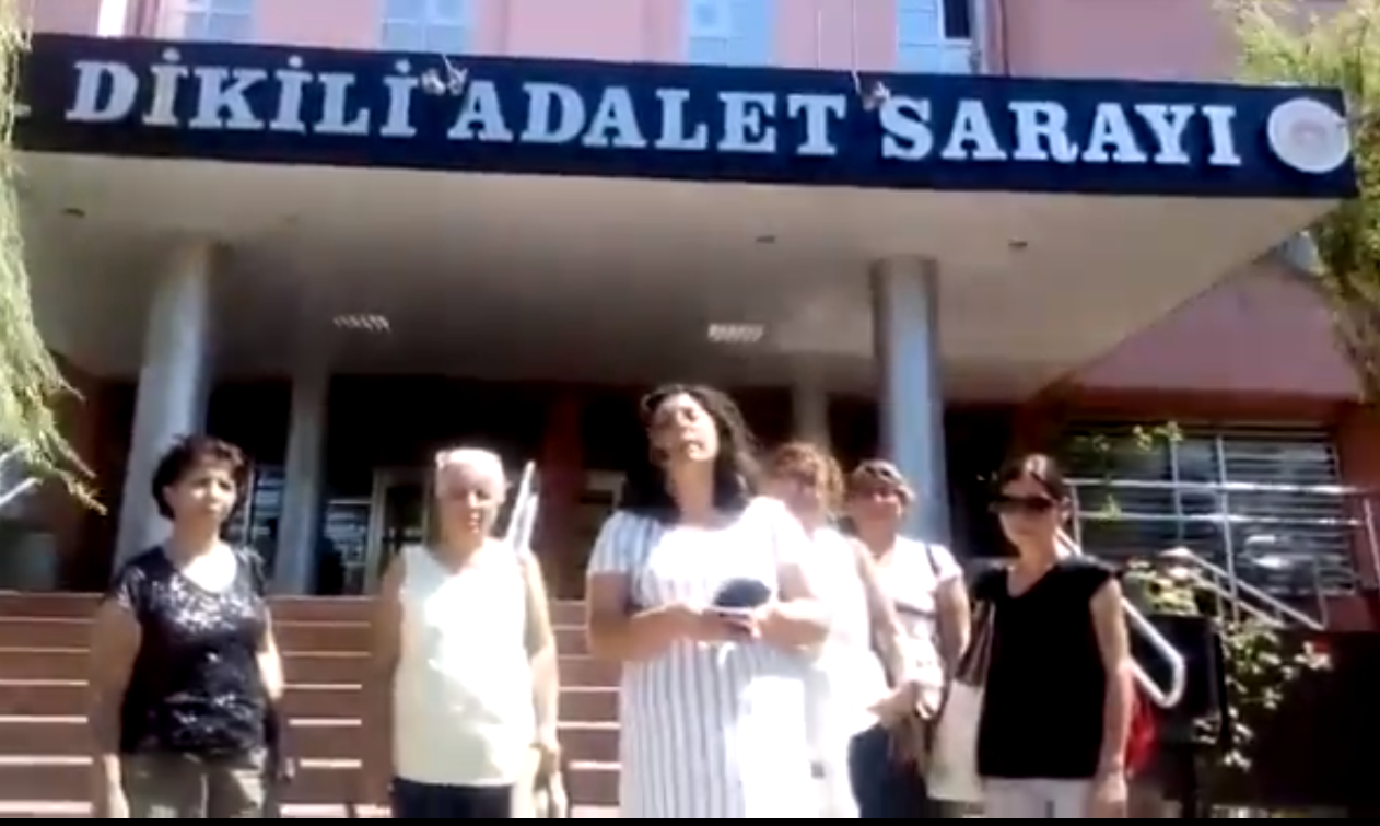 Bizler haklarımızı savunmaya devam edeceğiz, keyfi uygulamaların, görevlilerin görevinden kaçmasının önüne geçmek için bugün bu suç duyurusunda bulunmayı bir zorunluluk olarak kabul ettik ve bugün buradayız. Hukuksuzluk kadın mücadelesi ile son bulacak. Kampımızı yaptık yolumuza devam edelim, demeyeceğiz. Bu yüzden de hukuksuz sürecin yasal olarak da takipçisi olmak için bugün Dikili’de Adalet Sarayı önündeyiz. Hukuksuzluğu, bu keyfi düzeni, kamu görevini suistimal etmenin önüne geçmek için hiçbir zaman da mücadelemizden vazgeçmeyeceğiz.