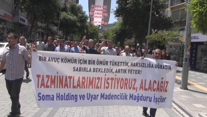 Manisa Soma’da 13 Mayıs 2014’te 301 madencinin hayatını kaybettiği Soma Katliamı’ndan sağ kurtulan maden işçileri Soma Holding’in mahkeme kararlarına rağmen ödemediği tazminatlarını almak için yürüyüş yaptı.