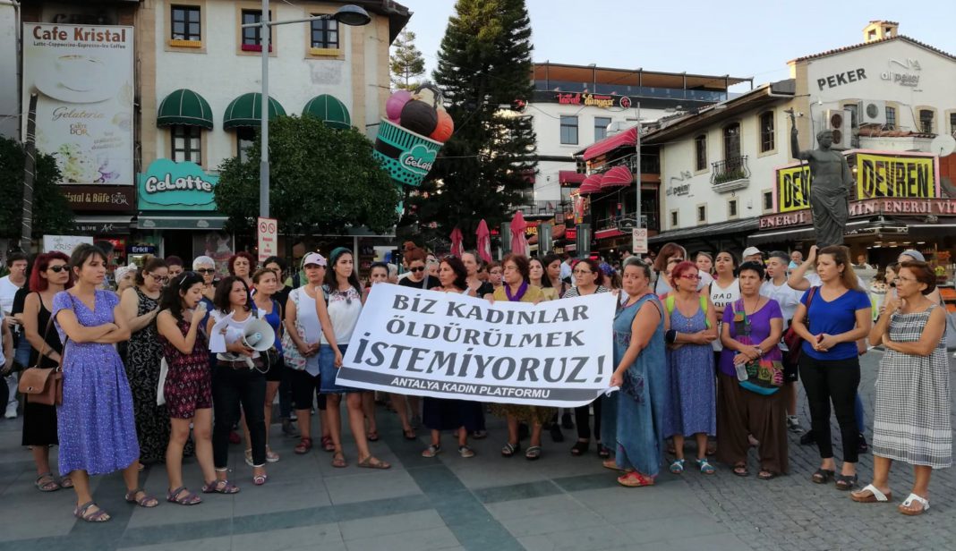 Antalya Kadın Platformu, 4 yıl önce boşandığı erkek tarafından vahşice öldürülen Emine Bulut için sokağa çıktı. Yapılan açıklamada 2018 yılında öldürülen 440 kadına vurgu yapan kadınlar “Son yıllarda kadına karşı şiddet ve kadın cinayetleri eğitimli, eğitimsiz, köylü, kentli, genç, yaşlı kadın demeden sistematik bir şekilde artmaktadır. 2018 yılında 440 kadın,son 19 ayda 652 kadın,geçtiğimiz Temmuz ayında ise 31 kadın erkekler tarafından vahşice katledildi. Yine en son Kırıkkale’de 18 Ağustos’ta Menderes Caddesi’ndeki bir kafede Fedai Baran, 4 yıl önce boşandığı eski eşi Emine Bulut’u kızının gözü önünde vahşice vücudunun çeşitli yerlerinden bıçalayarak katletti. Emine Bulut’un ‘’Ölmek istemiyorum’’ diyen çığlıklarına,kızının ‘’lütfen ölme anne’’ feryatlarına duyarsız kalmak insanlık onuruna yakışmaz,sessiz kalınamaz” dedi.
