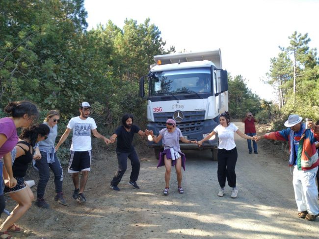Yürüyüşleri sırasında gelen iş makinelerini sahaya sokmayan direnişçiler, kamyonların içeri girmesini engelledi. Yapılan açıklamanın ve orada bulunanların yazdığı “Kaz Dağlar’ı andı”nın okunmasının ardından şantiye kapısı önünde şarkılar söyleyip dans eden direnişçiler, nöbet alanına döndükleri sırada tekrar bir iş makinesi ile karşılaştı.